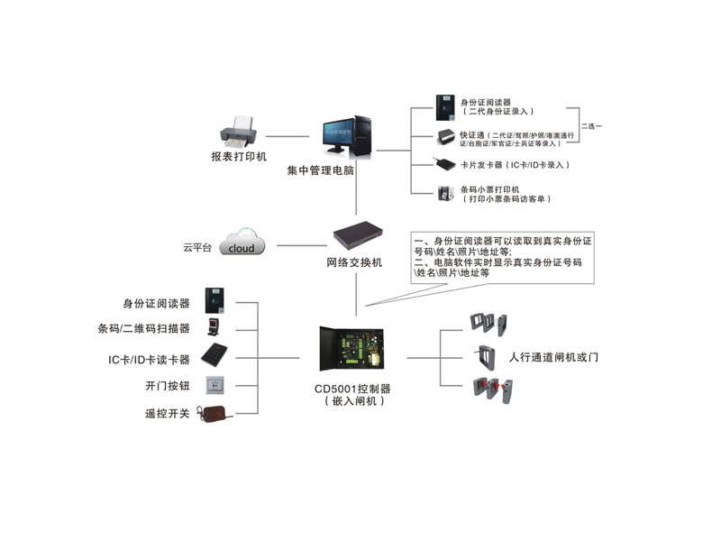 身份证免权限:刷身份证后直接进入、后台软件记录身份证上的信息及进出时间、人数统计 、便于治安管控